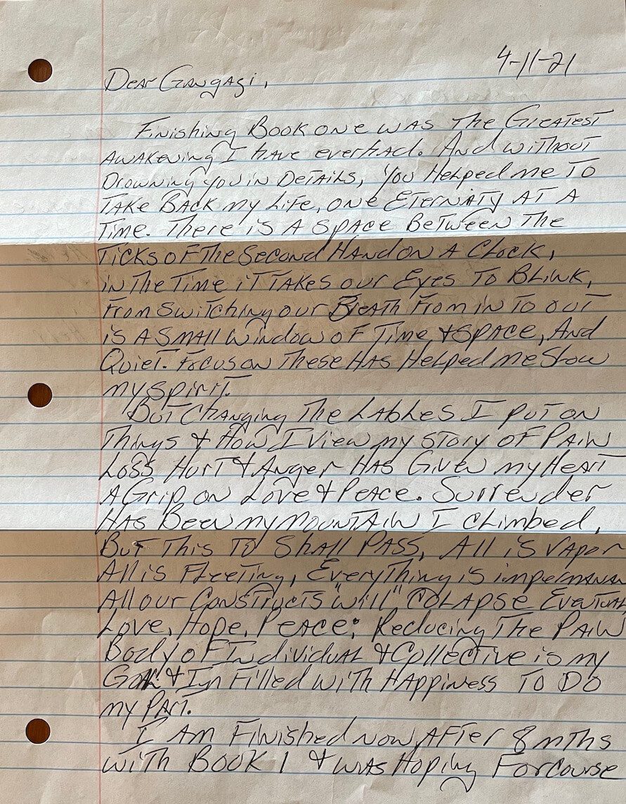 We also receive beautiful reports from prisoners—letters that will make your heart overflow. Today, I want to share one of those letters with you. Jeffrey is currently incarcerated in a Texas prison. He participates in Gangaji’s course by mail and shared with us a letter that is a stunning confirmation of self. I asked Gangaji to read Jeffrey’s letter so I could share it here with you and the world.