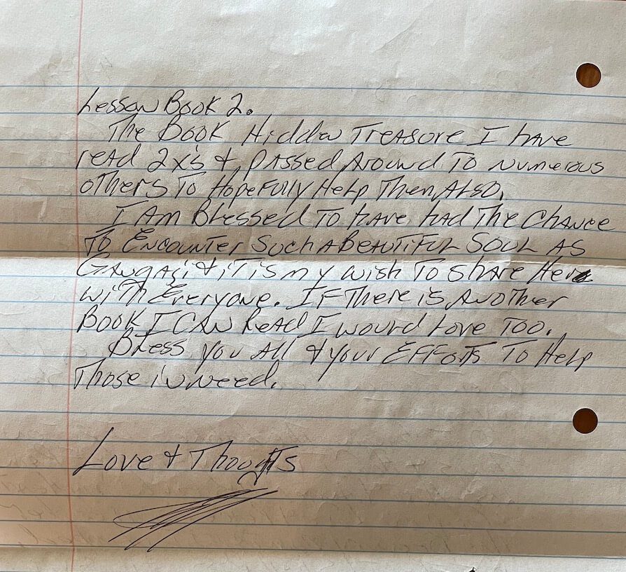 One of the great privileges of opening the regular mail at the Gangaji Foundation is reading the letters sent to us from men and women who are living behind bars. Some prisoners are writing to request a book, to join the Freedom Inside course by mail, or to inquire about corresponding with a volunteer. We are thrilled to receive each and every one of the hundreds of requests that arrive in the mailbox every year!