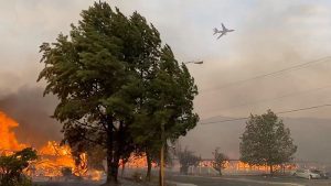 Watching a whole town burn is a lot to take in. We could hear constant explosions coming from downtown, and see what must have been 30-foot flames erupting. Air tankers began dropping fire retardant, while two helicopters drew water from a pond nearby, dumping their load on the fiery river of burning homes and businesses.
