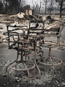 As roads in town opened up and we were allowed to drive through the areas that had burned, what greeted us was devastating. Whole neighborhoods had been flattened. The intimacy of small details left behind, like a garden bench, or the shell of the patio set, or a niche on a chimney, reminded me of photos from war zones. Everything was grey and ashen, the tangled metal of collapsed roofs and burned-out cars, the skeletons not of people, but of their lives left exposed by the side of the road for all to see.